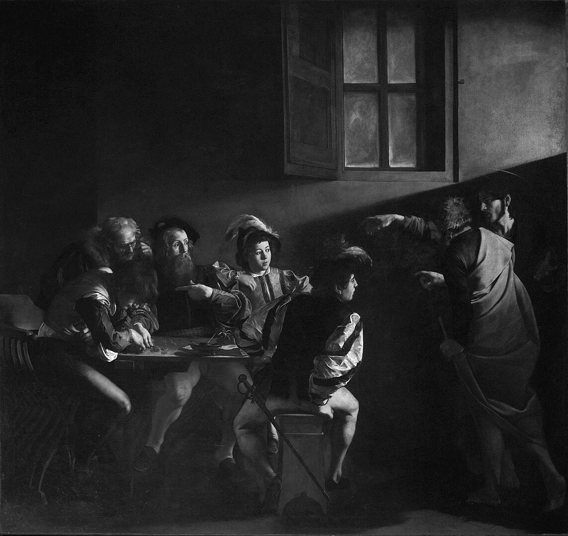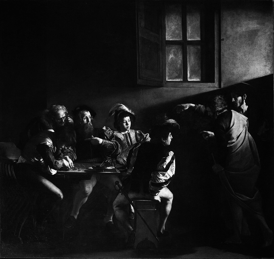 For this post, we will be converting the Calling of Saint Matthew by Caravaggio into grayscale. Caravaggio's paintings are striking in their use of light. We aim to preserve that quality while transforming this masterwork to grayscale.